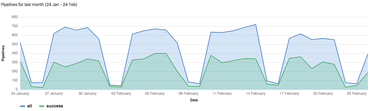 通过收集项目的所有可用流水线来收集流水线统计信息,无论状态如何。每一天的可用数据基于流水线的创建时间。