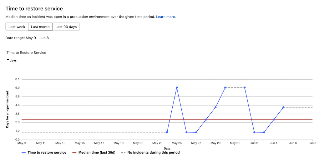 恢复服务时间图表显示有关事件在生产环境中解决的中位时间的信息。此图表可用于群组和项目。