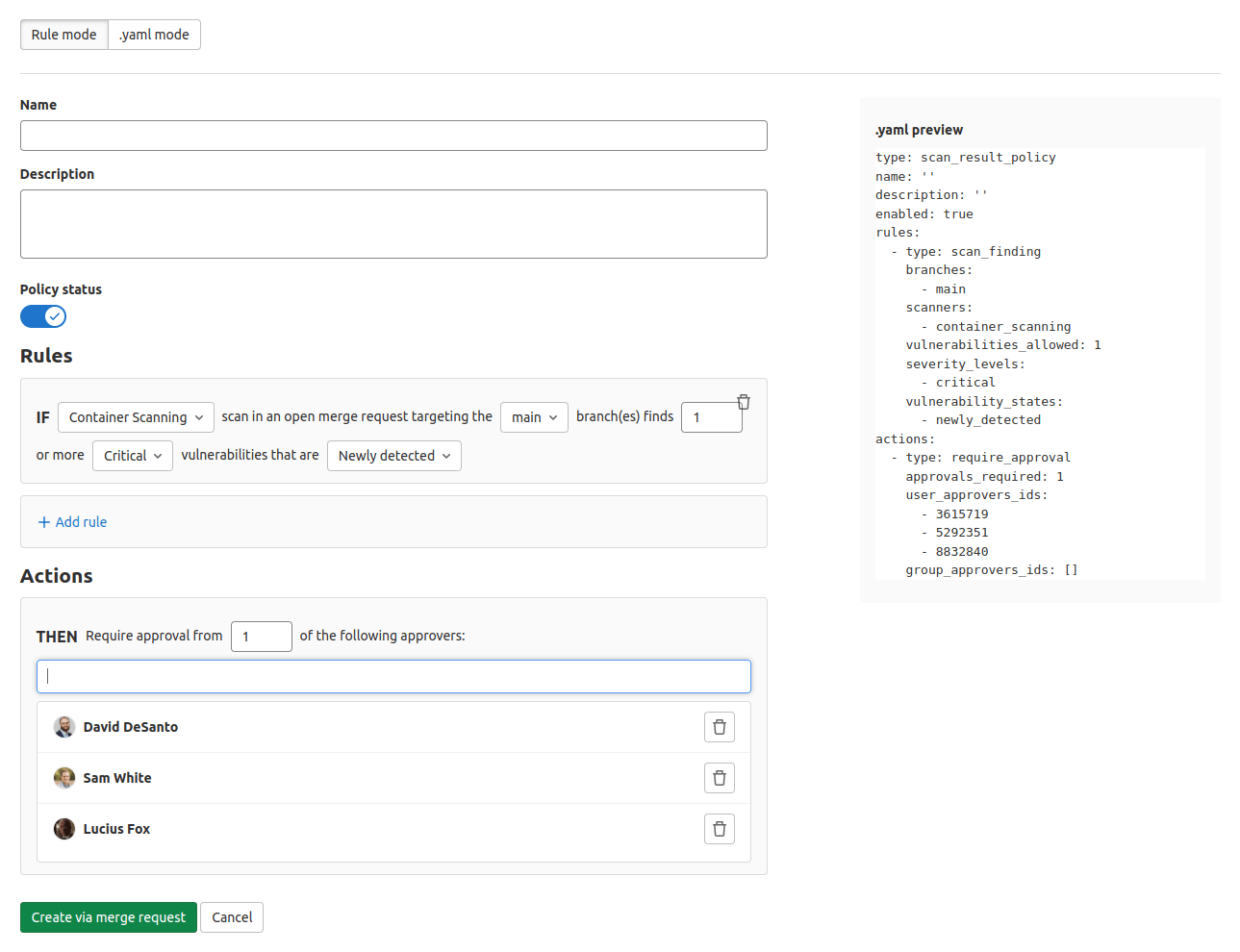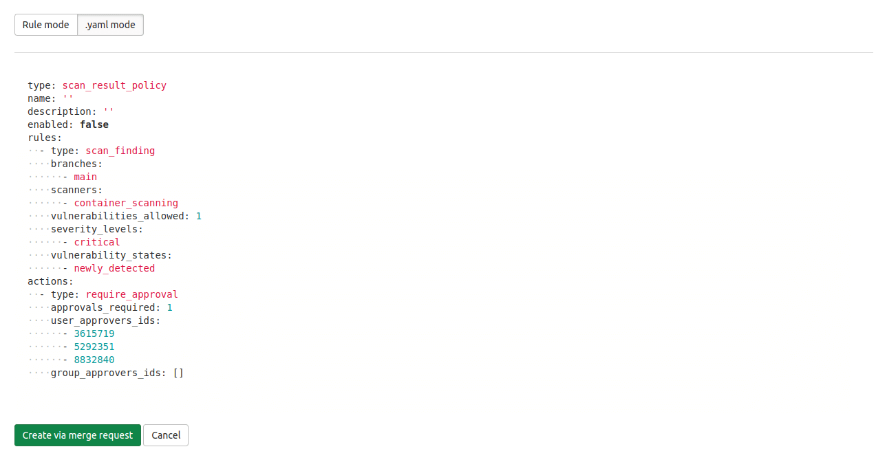 完成创建或编辑策略后,选择 使用合并请求配置 按钮保存并应用它,然后合并生成的合并请求。当您按下此按钮时,将验证策略 YAML 并显示任何产生的错误。 此外,如果您是项目所有者并且安全策略项目之前未与此项目关联,则在创建第一个策略合并请求的同时会自动创建和关联一个新项目。