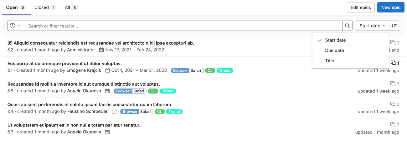 - 从下拉菜单中选择范围或输入纯文本以按史诗标题或描述进行搜索。