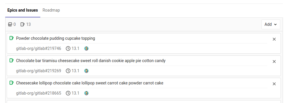 属于史诗的群组或任何史诗的子群组的现有议题,能够被添加到史诗中。新添加的议题出现在史诗和议题标签的议题列表的顶部。