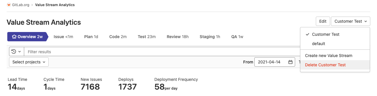 - 群组价值流分析的 DORA API-based 部署指标从旗舰版移动到专业版于 14.3 版本。