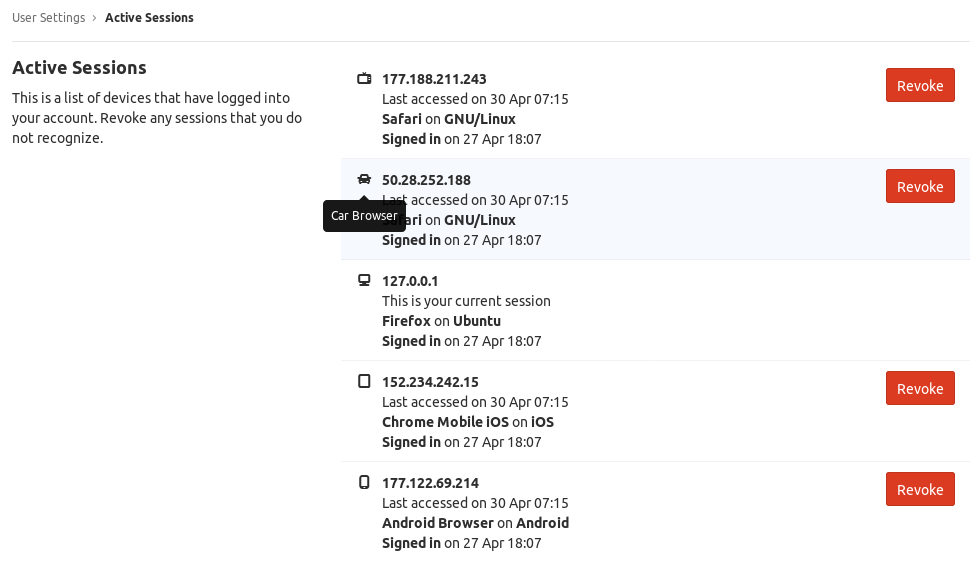 极狐GitLab 列出了所有已登录到您帐户的设备。您可以查看会话,并撤销任何您不认识的会话。