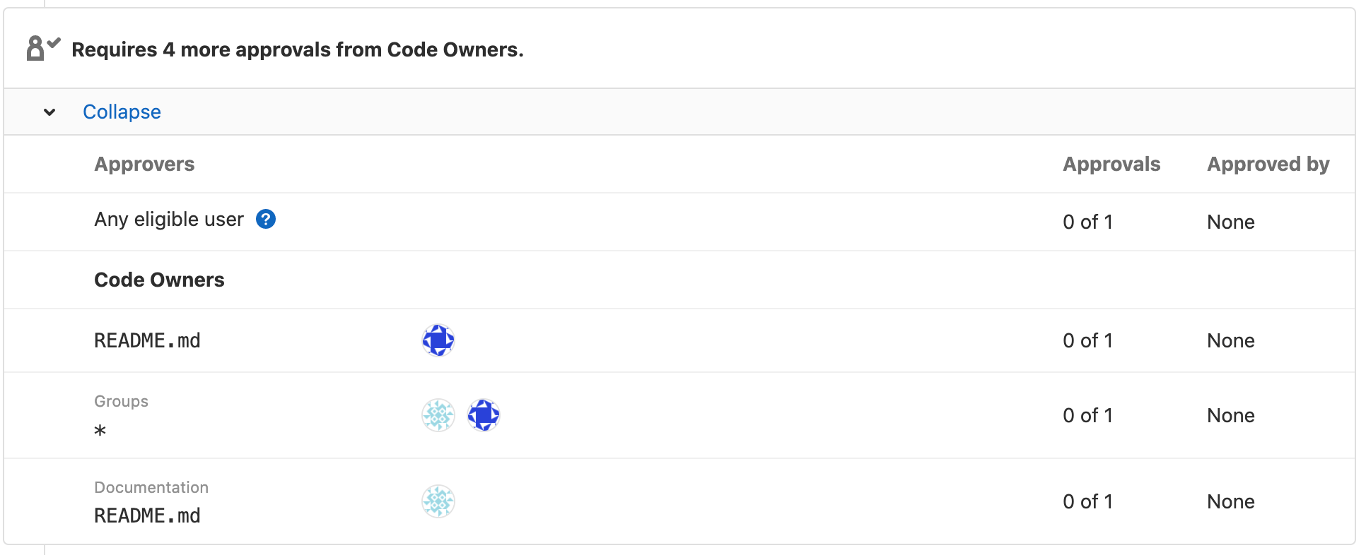 合并请求部件中的每个代码所有者都列在一个标记下。 下图显示了 群组 和 文档 部分: