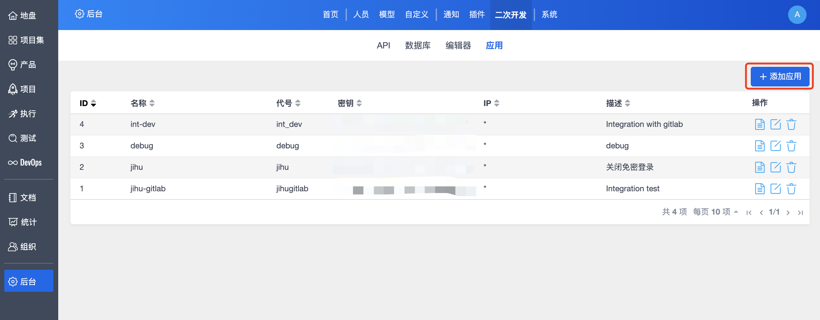 - 访问 管理员 页面并选择 二次开发 > 应用。