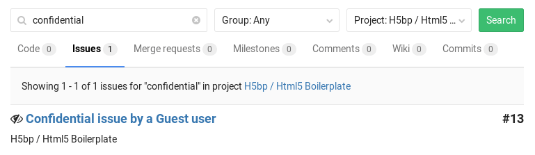 私密议题也隐藏在非特权用户的搜索结果中。例如,以下是具有维护者角色和来宾访问权限的用户在项目的搜索结果中分别看到的内容。