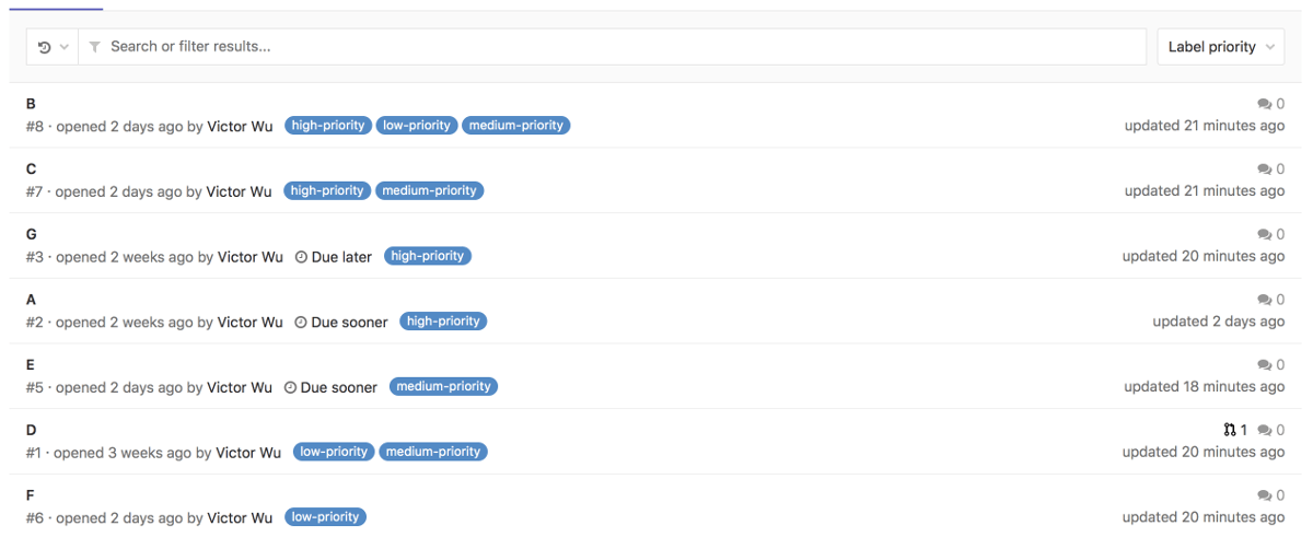 在合并请求和议题列表页面(对于群组和项目),您可以按 标记优先级 或 优先级 排序。