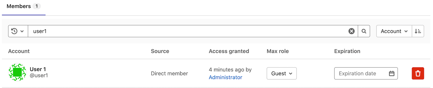 - 用户 1 直接属于该项目。在 源 列中,他们被列为 直接成员。