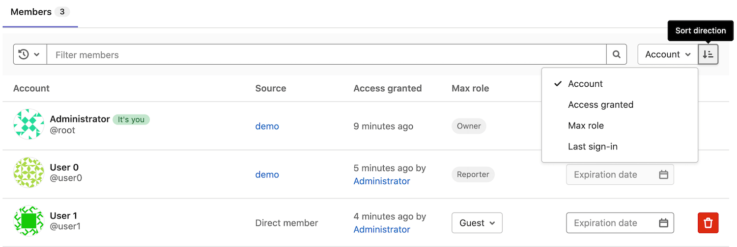 您可以按升序或降序,根据 账号、已授予访问、最大角色 或 上次登录 对成员进行排序。